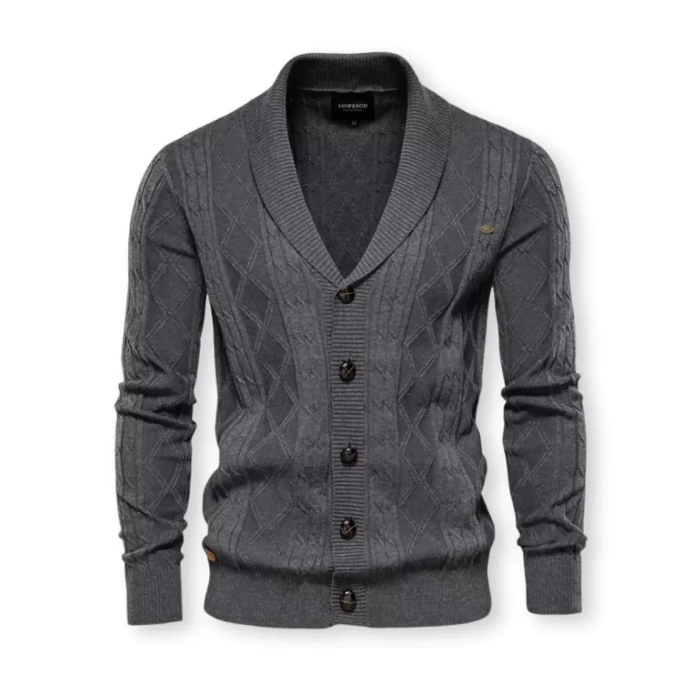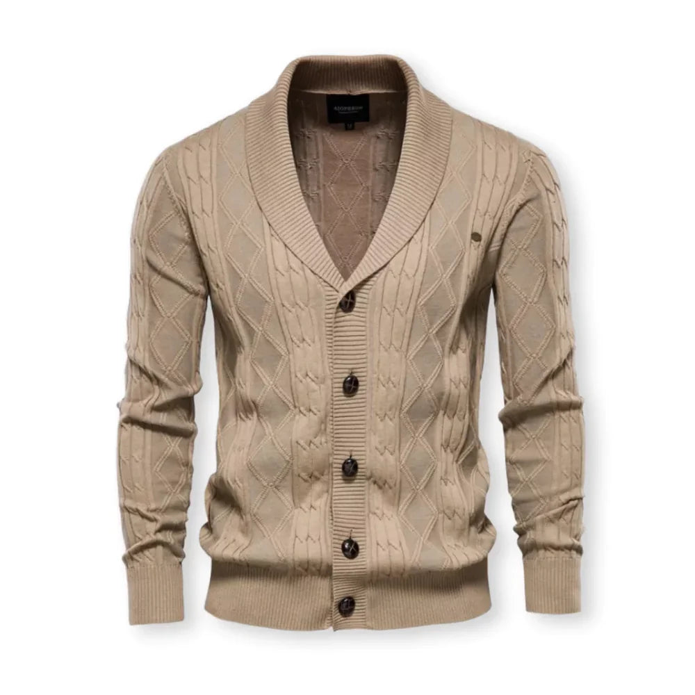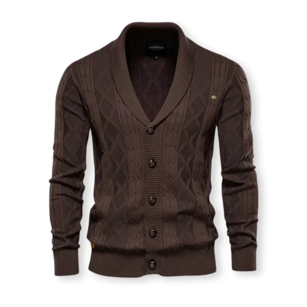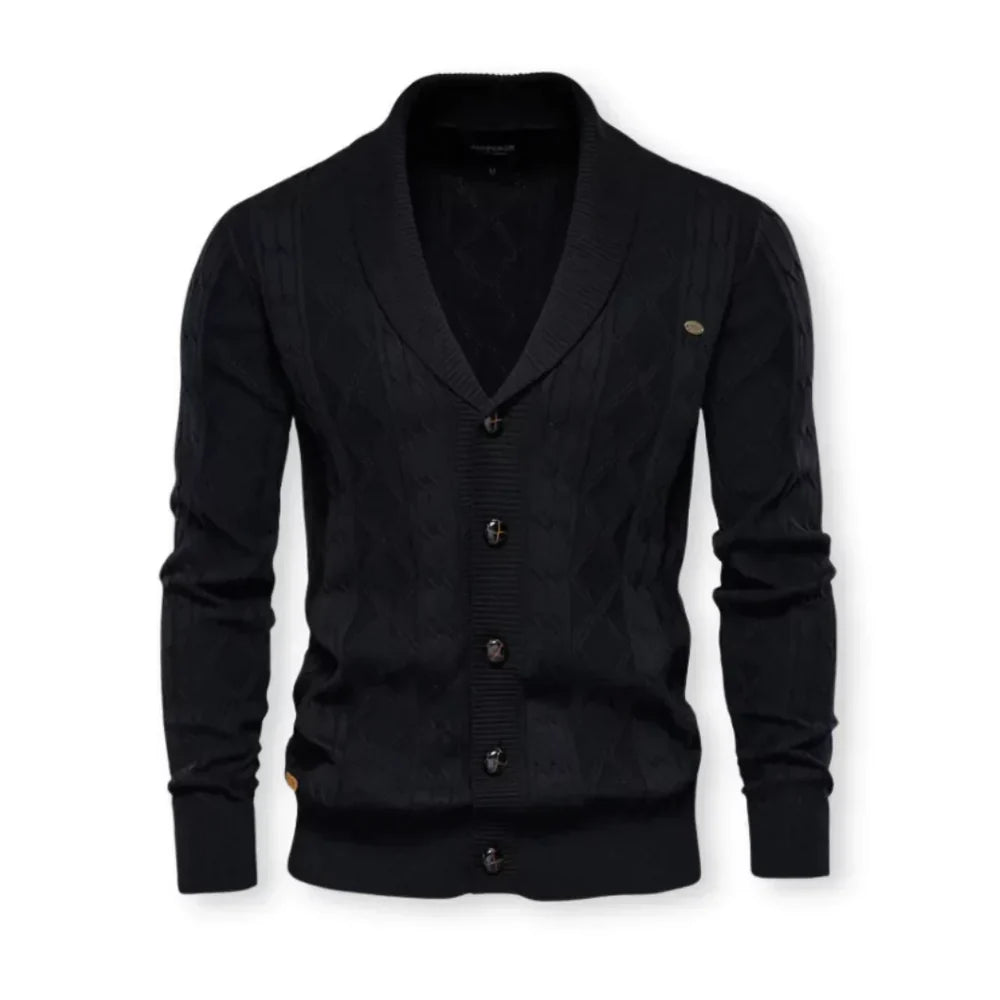 Elevate your everyday with a refined layer that balances timeless design and modern ease. A shawl collar, clean button front, and subtle diamond knit create a confident silhouette that shifts effortlessly from off-duty to smart layering.